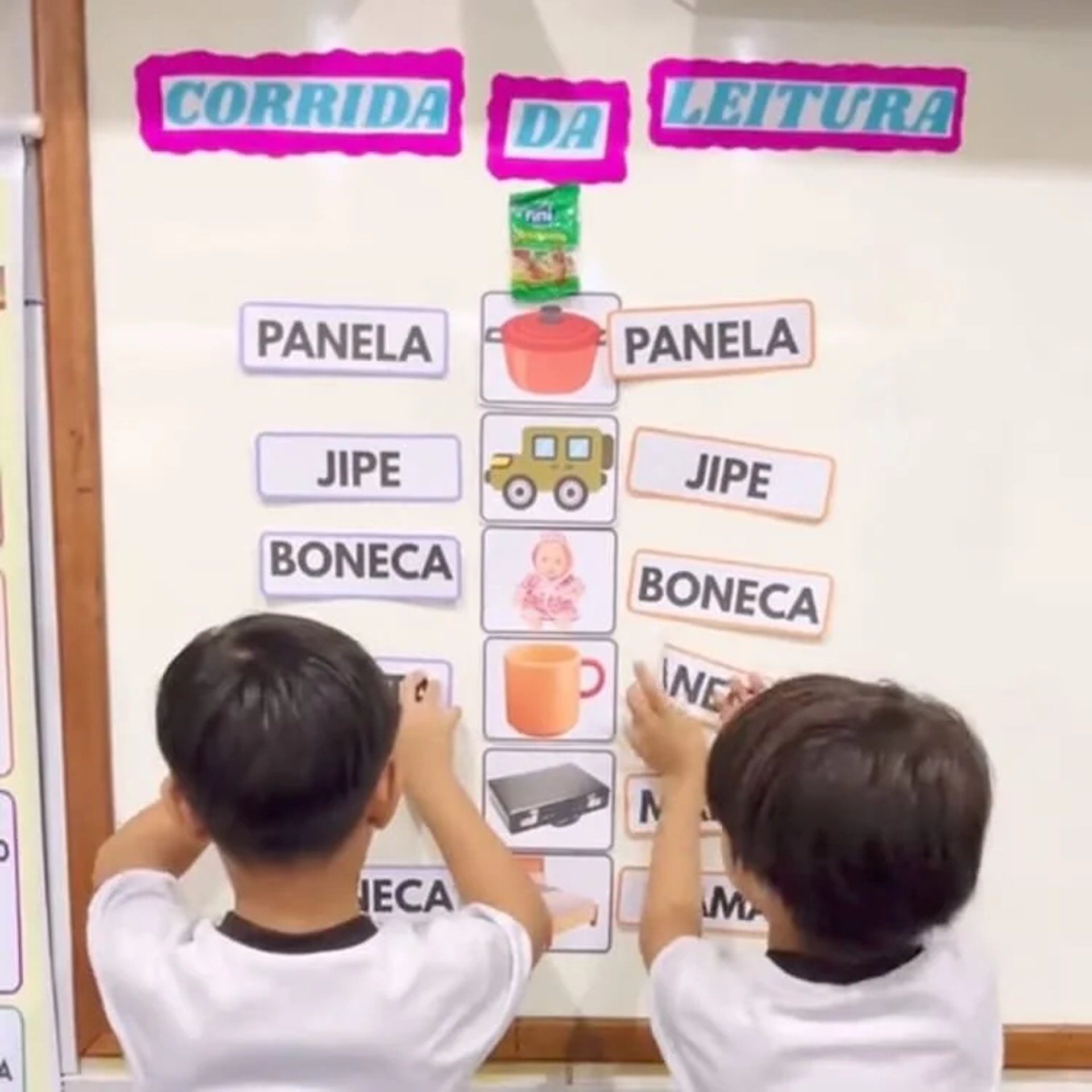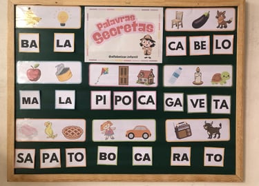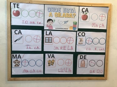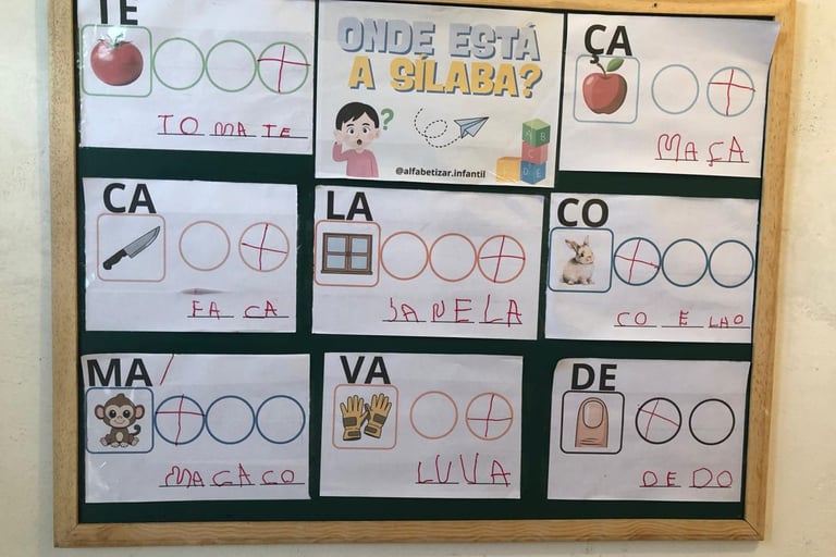 De forma lúdica, as crianças desenvolvem a consciência silábica e a habilidade de identificar, combinar e formar palavras.